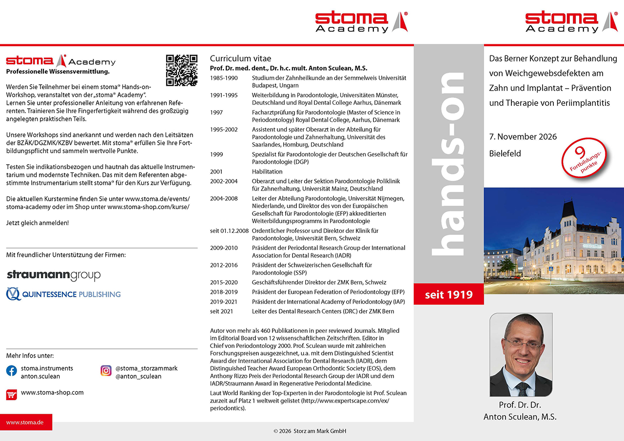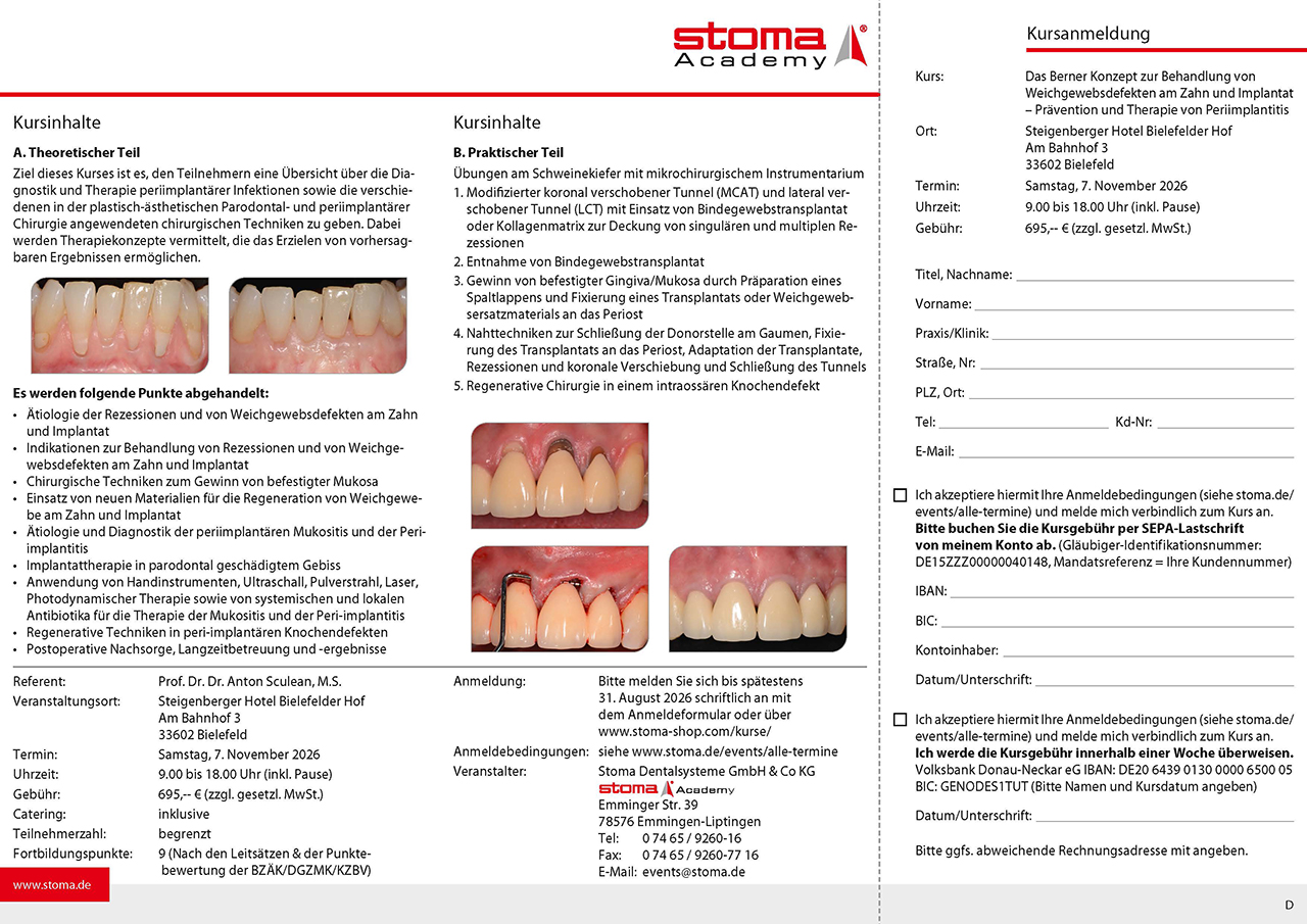 window.ga=window.ga||function(){(ga.q=ga.q||[]).push(arguments)};ga.l=+new Date; ga('create', 'UA-23711421-3', 'auto'); ga('set', 'forceSSL', true); ga('set', 'anonymizeIp', true); ga('require', 'displayfeatures'); ga('require', 'cleanUrlTracker'); ga('require', 'outboundLinkTracker'); ga('require', 'ec'); var match = RegExp('[?&]gclid=([^&]*)').exec(window.location.search); var gclid = match && decodeURIComponent(match[1].replace(/\+/g, ' ')); if(gclid){ ga('set', 'dimension1', gclid); } ga('send', 'pageview'); ga('set', 'nonInteraction', true); setTimeout("ga('send', 'event', 'read', '20 seconds')", 20000); Prof. Sculean | 07.11.2026 in Bielefeld | Das Berner Konzept zur Behandlung von Weichgewebsdefekten | Kurse | Stoma Shop